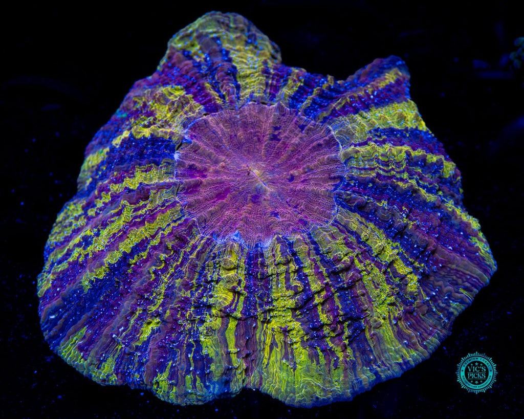 6" in diameter, WYSIWYG and conditioned to life in a reef aquarium by WWC! br> Keep Acanthophyllia at the bottom of your reef (preferably on the sand) and provide them with low alternating flow. Target feed it once a week with a good quality meaty frozen food, but just make sure their feeding tentacles are out first, as it not it will roll right off the coral and end up somewhere you usually don't want it (like under your rock structure, where it will rot and possibly mess up your water parameters). A good time to make sure the feeding tentacles are out, is right before your lights come on, or just after they turn off. You can speed up their feeding response process by squirting a little liquified reef food into the water column.