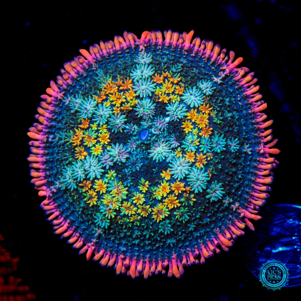 Think of every shade of the rainbow can be found in this Carpet Mushroom! Now here's the cool fact about Carpet Mushrooms, they grow and grow and grow! We have had several grow to around 9" in diameter! So if you would like a gigantic mushroom to take up a lower section of reef, this is the shroom for you! Make sure to place this mushroom low, like super low in your reef (less than 100 par), with low flow. We also recommend target feeding it once per week, and if you do you'll be overjoyed to see it start to grow more quickly and eventually bud off and spread out in all directions! The trick with feeding Mushroom Corals is to hold a piece of meaty food in place with a pair of tweezers until the Mushroom grabs a hold of the food. And once the mushroom grabs onto it you will then be able to watch the cool process of the mushroom slowly closing up around the piece of food. It’s awesome to watch! Just like everything in reefing, be patient and you will be amazed at what transpires!
