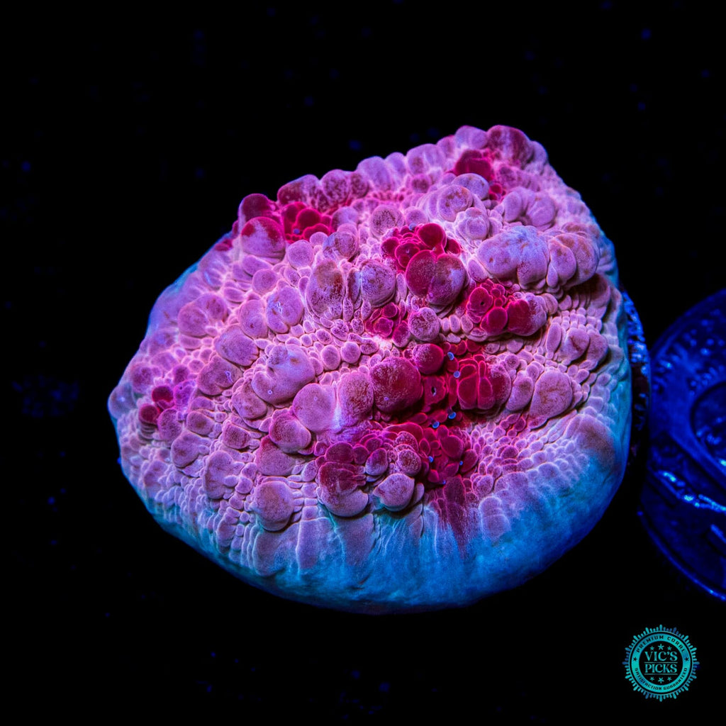 The WWC Freezer Burn is a stunning bluish red Oxypora chalice that bounces! And these bubbles can be huge! The bubble in the mother colony photo huge at close to 1" in diameter! As the mouths are pretty small on this Chalice, you'll want to target feed (weekly) a good quality refrigerated food such as Oyster Eggs, etc... Also, don't blast them with light as they prefer around 125 to 150 par and make sure to keep them in minimal flow.
