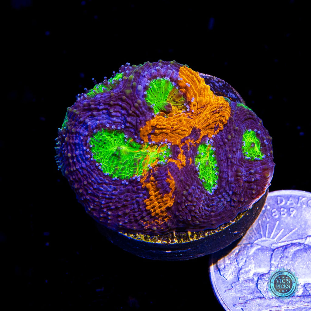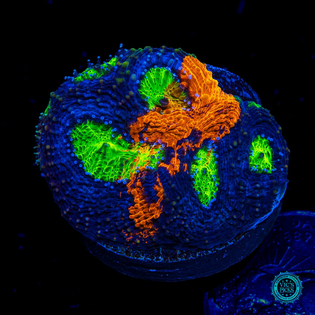 1.25" in diameter, WYSIWYG and fully farmed by WWC! - The one and only Mango Tango Echinata! Pretty much the hottest Echinata on the market today. This piece will blow your mind! We've been farming this Acanthastrea echinata for close to 8 years and it holds its color perfectly! Grab it as we only release around 10 pieces per year!