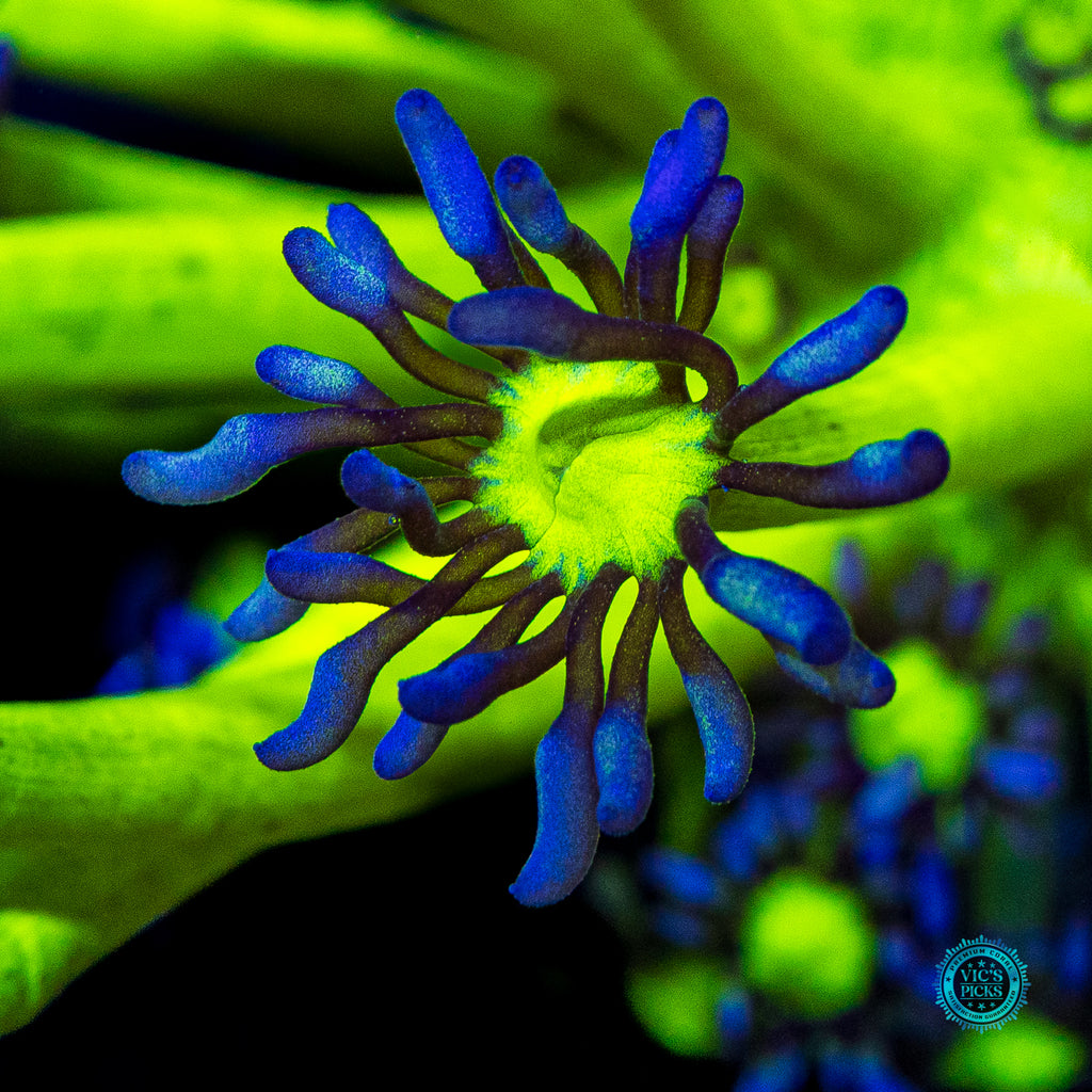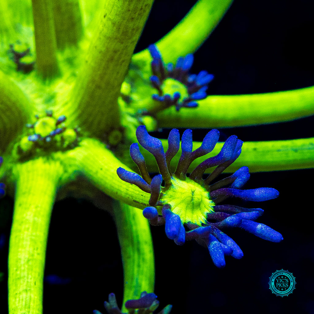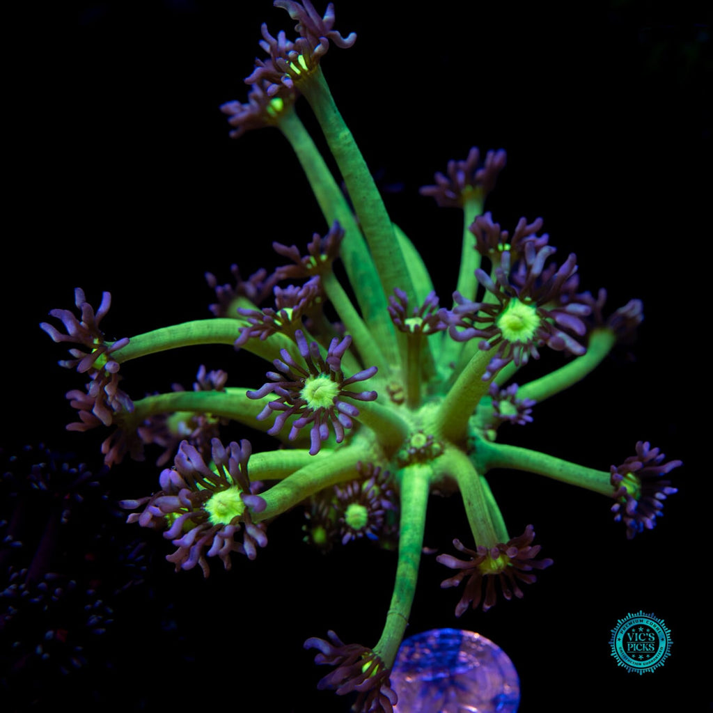 We have been growing out this unique color morph for several years now. The insaely bright neon green stalks contrast the lavender petal of the polyp so beautifully. AND as it grows out it stays THAT BRIGHT! Unfortunately, Goniopora still get a bad rap. Gone should be the thought of them possibly not doing well for the intermediate or advanced reefer. We have over 40 varieties growing out in our farm and if we can do it, so can you! Goniopora prefer lower to medium-low par (125 to 175), with medium alternating flow and to be target fed an SPS food (due to their smaller mouths at the end of each tentacle) several times weekly. Just don't over do it. A couple of squirts is all it takes.