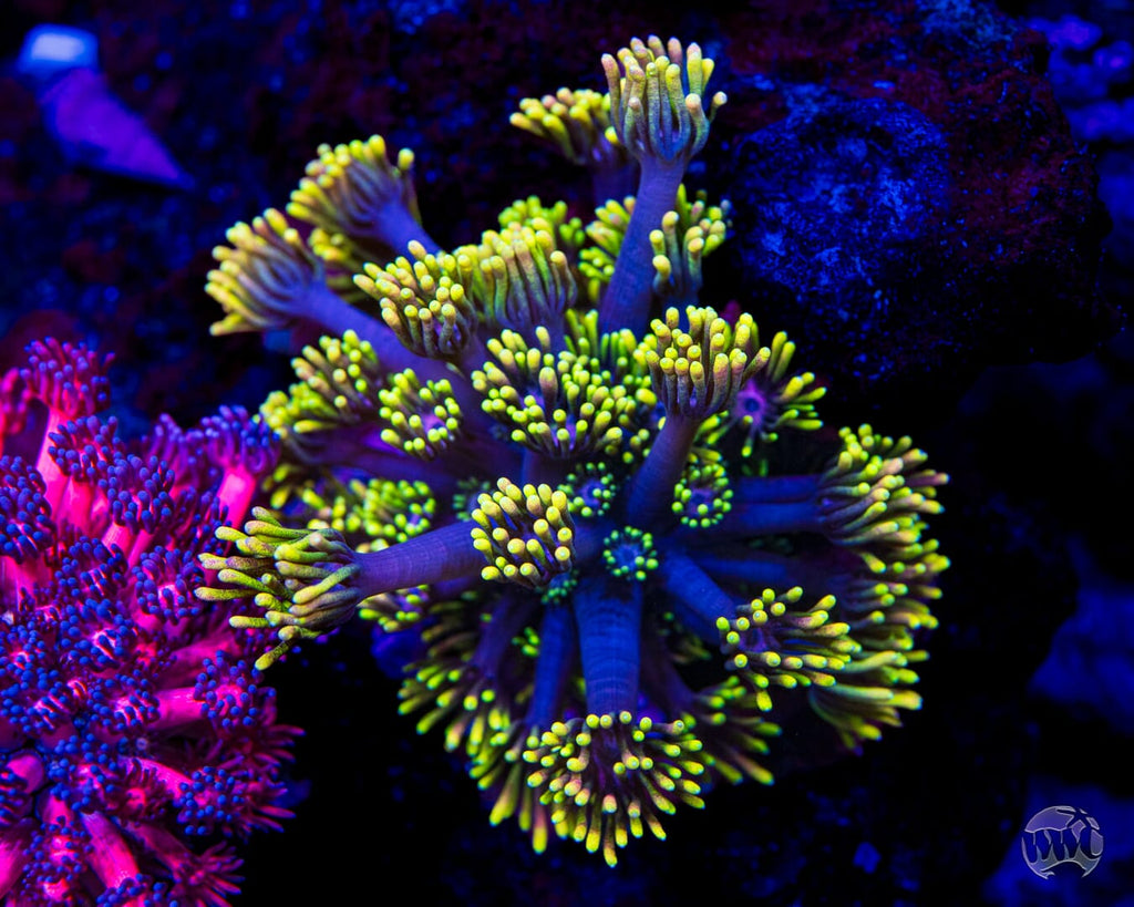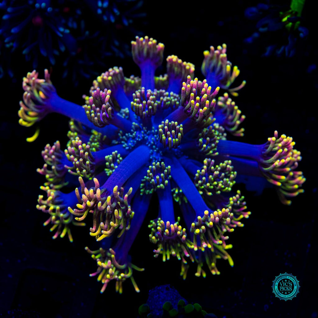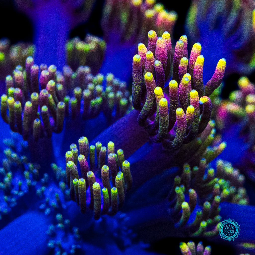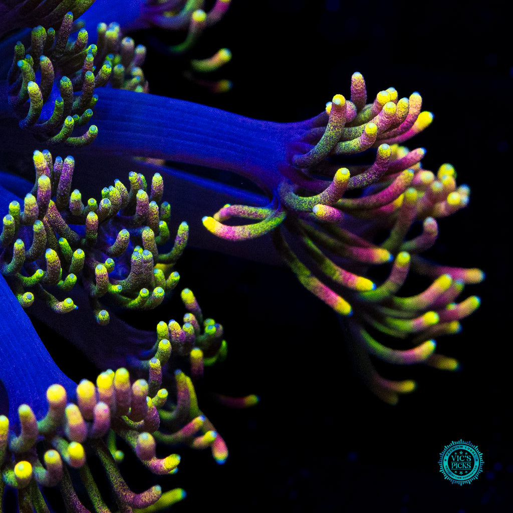 Unfortunately, Goniopora still get a bad rap. Gone should be the thought of them possibly not doing well for the intermediate or advanced reefer. We have over 40 varieties growing out in our farm and if we can do it, so can you! Goniopora prefer lower to medium-low par (125 to 175), with medium alternating flow and to be target fed an SPS food (due to their smaller mouths at the end of each tentacle) several times weekly. Just don't over do it. A couple of squirts is all it takes.