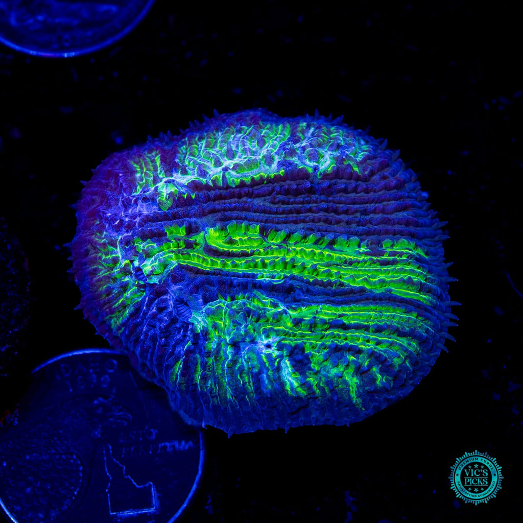 2" WYSIWYG and fully aquacultured by WWC! This marbling tongue coral of neon green, purple and blue is perfect for collectors of rare corals and for begginers who are looking for something completely different as they are super hardy!