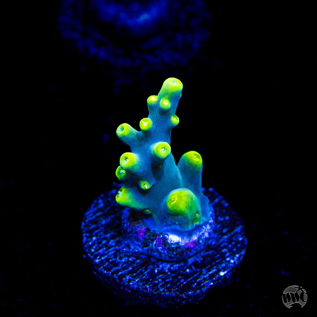 Its structured branching growth adds depth and motion to your reef, while the vivid contrast between base and tip coloration makes it pop from across the room. Like many WWC signature pieces, the Yodaz thrives in high-energy environments with intense lighting and turbulent flow.