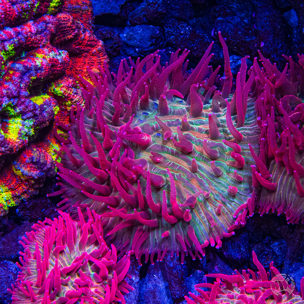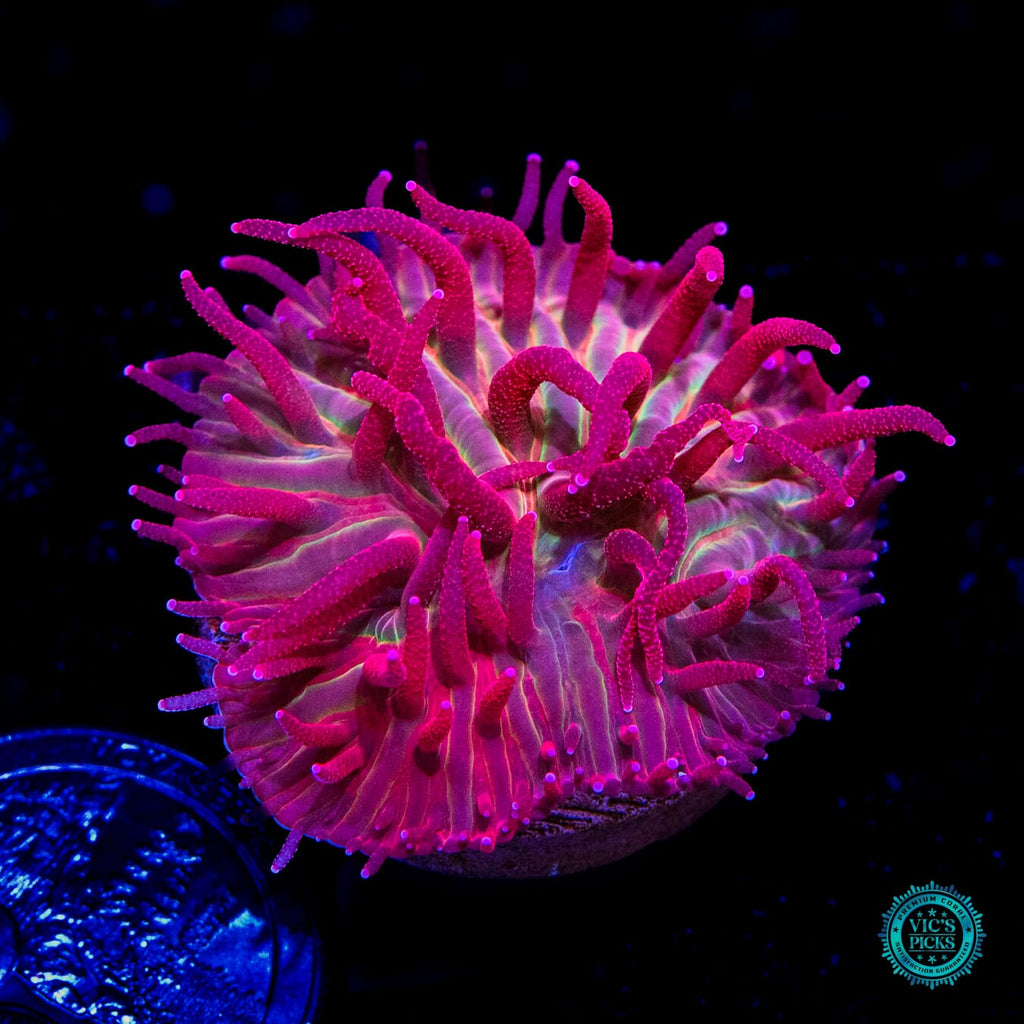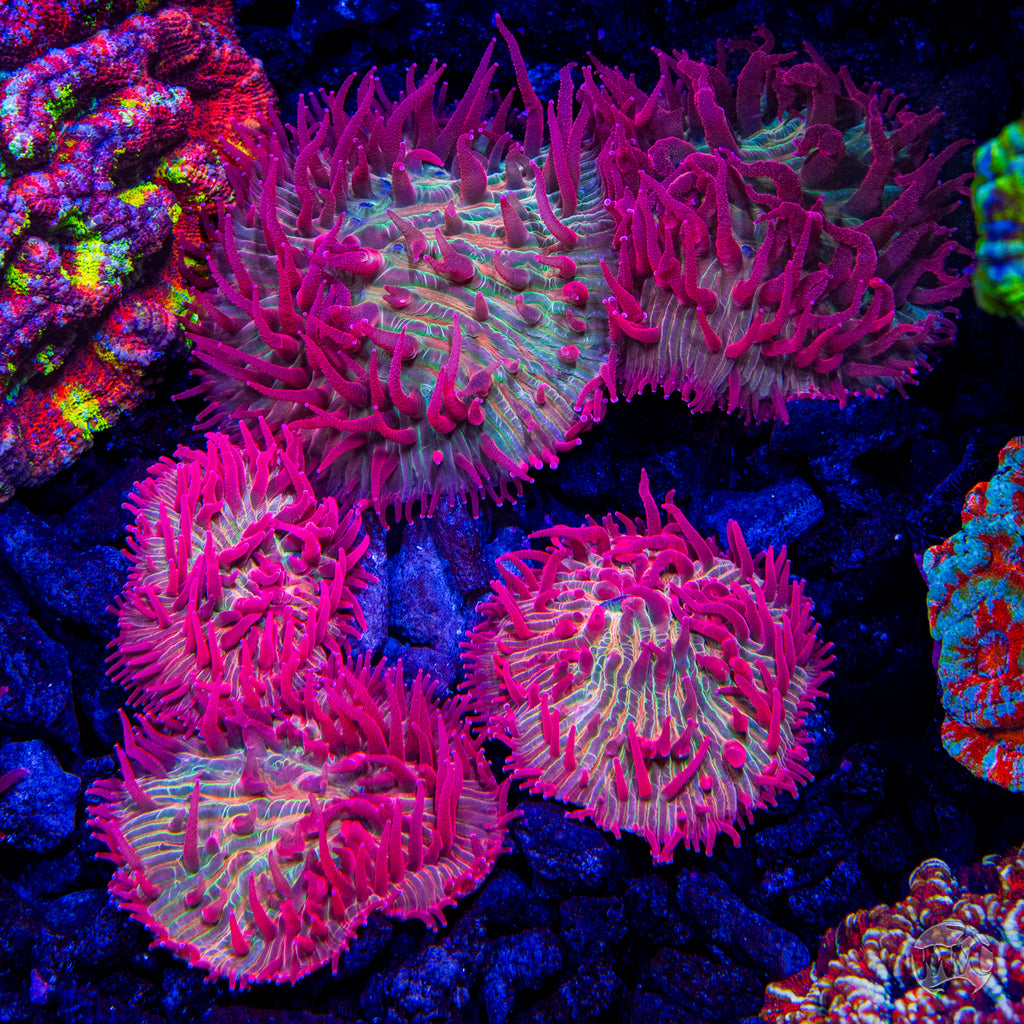 This incredible super duper red tentacle Diaseris Plate Coral has it's feeding tentacles out most of the time, so feeding them can be relatively easy. The trick with feeding them is to hold a piece of meaty food in place with a pair of tweezers until the Plate Coral grabs a hold of the food with their tentacles. In regards to placement and flow, place them on the sand where they can receive lower intensity light (around 125 or less par) and in an area of low to low-medium flow.