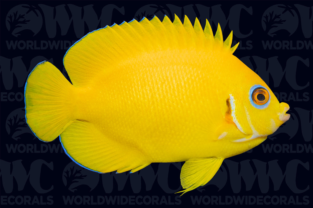 Centropyge angels are favorites among hobbyists due to their small adult size, striking coloration, and generally hardy nature. The Lemonpeel Angelfish is one of the most recognizable dwarf angels, prized for its brilliant yellow body accented with electric blue highlights around the eyes and fins. Like other dwarf angelfish, Centropyge flavissima can be territorial and aggressive toward other angelfish or similarly shaped species, especially in smaller aquariums.These angelfish are typically good feeders and will accept a wide variety of prepared foods, though a diverse diet is recommended and should be offered at least twice daily. In the wild, they graze on filamentous algae, sponges, tunicates, and other benthic organisms, so providing foods with marine algae and sponge matter is ideal. Because their natural feeding behavior includes occasional coral nipping, the Lemonpeel Angelfish is not considered reef safe, particularly with stony and soft corals. Centropyge flavissima grows to an adult size of about 5 inches and is best suited for aquariums of 55 gallons or larger with ample rockwork for grazing and hiding. This species is found throughout the Indo-Pacific, including reefs of the Central and Western Pacific, where it inhabits coral-rich lagoon and outer reef environments at depths ranging from shallow waters down to approximately 60 meters.