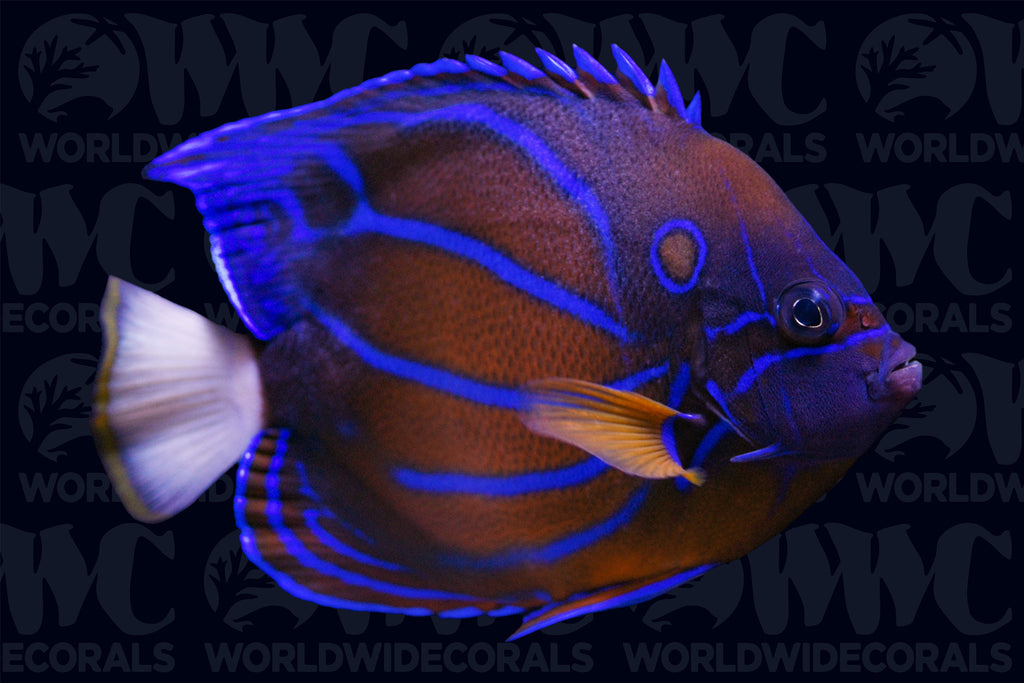 Angelfish come in a large array of colors, patterns and sizes that make them very sought-after. Unlike Centropyge angels, this genus is known for having large adult sizes. The Annularis Angel will be the crown jewel of your aquarium. This beautiful fish should be the only angelfish in the aquarium because they are aggressive towards others. The Annularis Angel like all Angelfish in this genus are hermaphroditic. It is not possible to tell a male from a female by looking at them. To keep them happy, provide an environment with substantial hiding places and swimming space. Rockwork is essential for hiding spaces and it provides algae for grazing. They maybe more shy at first but give them time to acclimate and they will begin to feel at home. Like most angelfish, the Annularis are not the best reef candidate because they nip at polyps and clam mantles. Be sure to provide a balanced diet of frozen meaty foods and high-quality dry foods and vegetables. They will grow to be a foot in size and will need an aquarium of 220 gallons when full grown. The Annularis Angelfish is from the Indo-West Pacific inhabiting coastal reefs up to 60 meters deep.