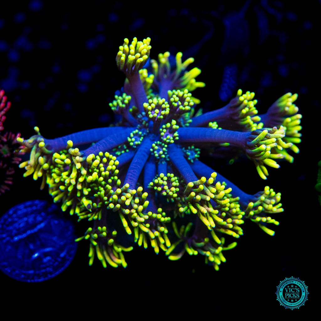 Unfortunately, Goniopora still get a bad rap. Gone should be the thought of them possibly not doing well for the intermediate or advanced reefer. We have over 40 varieties growing out in our farm and if we can do it, so can you! Goniopora prefer lower to medium-low par (125 to 175), with medium alternating flow and to be target fed an SPS food (due to their smaller mouths at the end of each tentacle) several times weekly. Just don't over do it. A couple of squirts is all it takes.