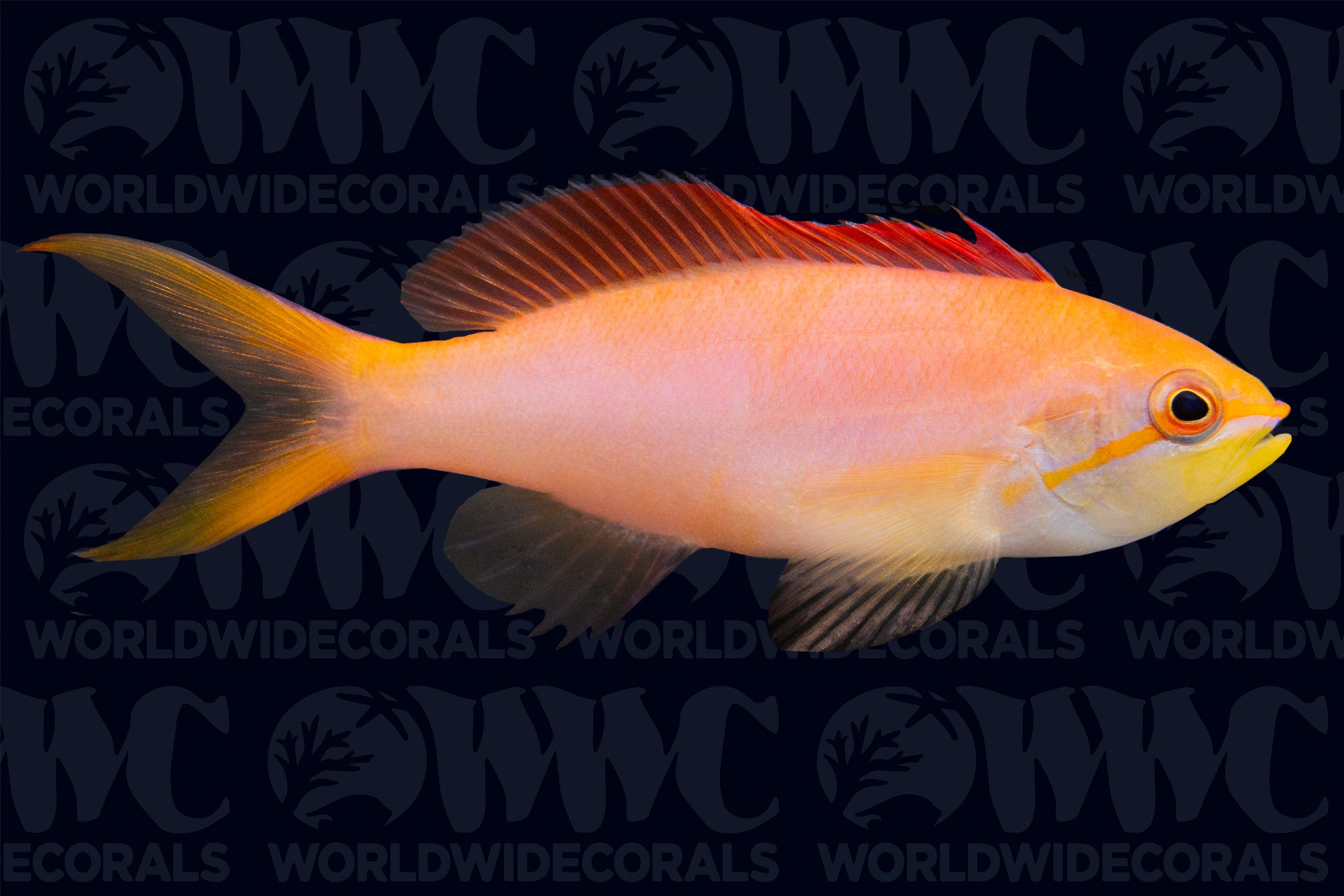 The Cirrhilabrus Wrasse is a genus that contains reef safe and exquisitely colored species that are also known for being very hardy. When starting a new aquarium, the Lineatus Fairy Wrasse can live in groups, but should be added last since they can be harassed by others. They do best with a varied diet of frozen meaty foods and marine pellets. Nori Seaweed can be offered to add variety to their diet. Feeding them multiple times a day is recommended since they are very active. Beware: They are jumpers, so a covered aquarium is necessary. They have a small adult size of 5”, which is also why they are so desired by hobbyists. This wrasse is considered to be one of the most beautiful in its genus and is highly sought-after. The Lineatus Fairy Wrasse inhabits clear outer reef slopes in the Western Central Pacific up to 55 meters deep.