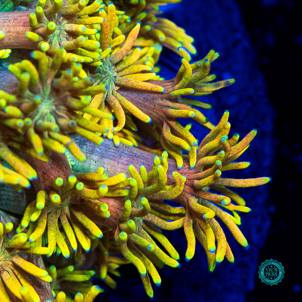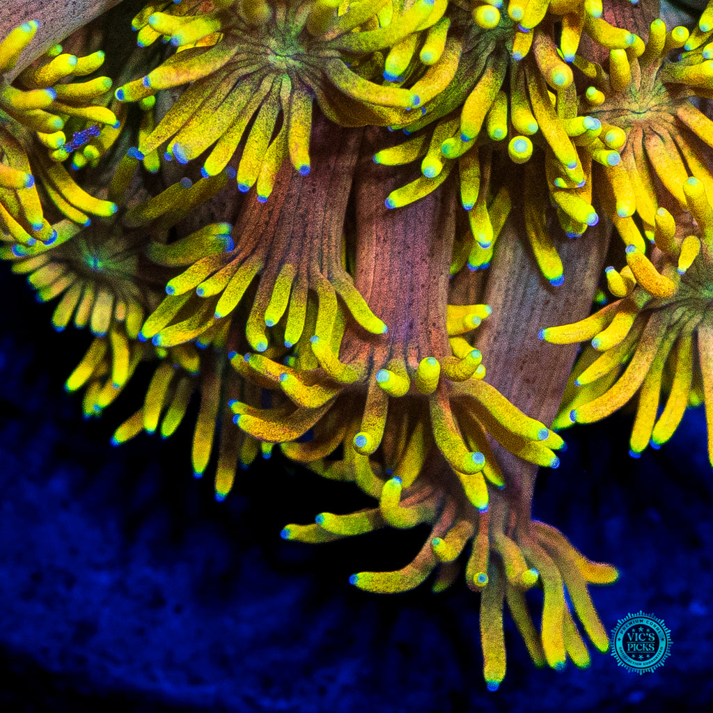 Unfortunately, Goniopora still get a bad rap. Gone should be the thought of them possibly not doing well for the intermediate or advanced reefer. We have over 40 varieties growing out in our farm and if we can do it, so can you! Goniopora prefer lower to medium-low par (125 to 175), with medium alternating flow and to be target fed an SPS food (due to their smaller mouths at the end of each tentacle) several times weekly. Just don't over do it. A couple of squirts is all it takes.