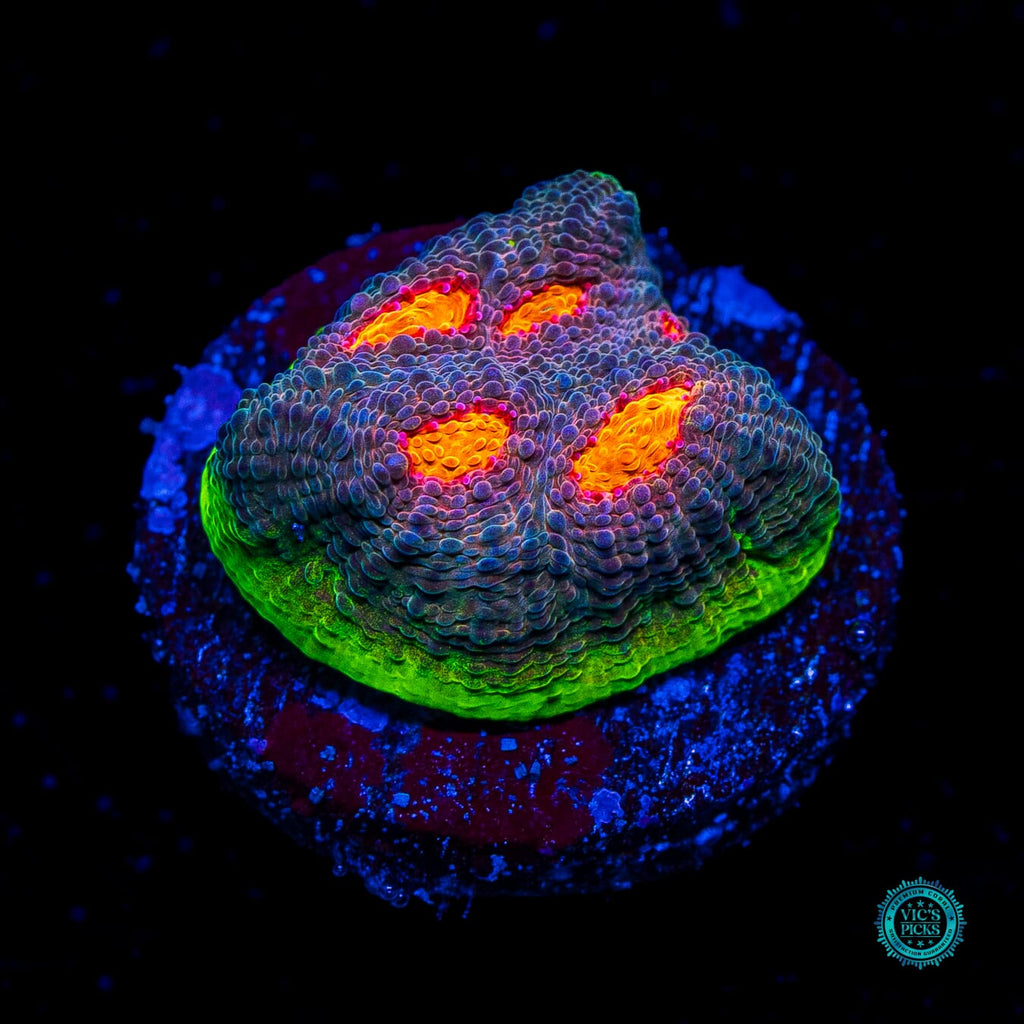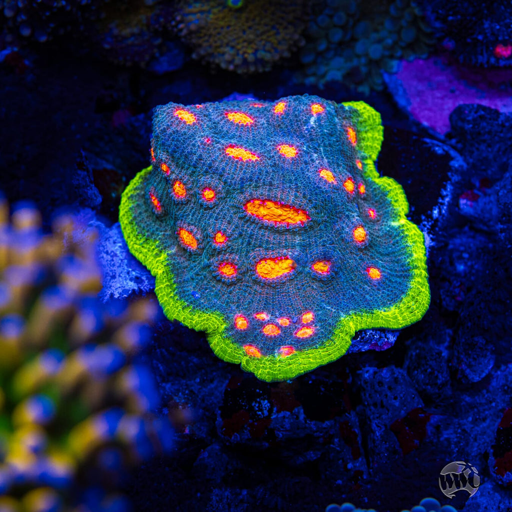 1.25" in diameter, WYSIWYG and fully aquacultured by WWC! Jason has been growing out this insane Crazy Fox chalice for over 10 years now. The glowing orange eyes, neon green rim make for an unmistakenably gorgeous chalice!