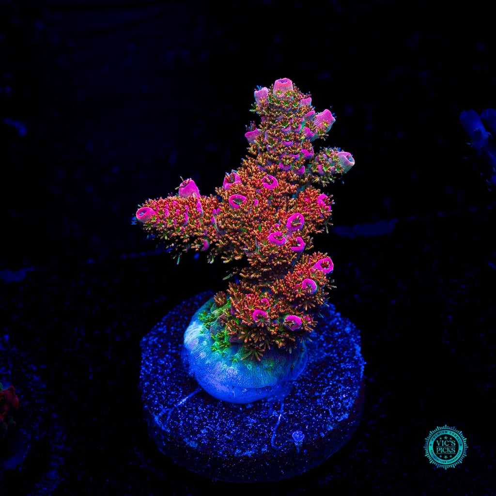 2" x 1" WYSIWYG and fully aquacultured by WWC! This insanely beautiful Acropora originally came from a wild Fiji colony over 9 years ago and was really nothing much to speak about at first. It took close to six months before we saw its underlying beauty come through. But once it adjusted to life in an aquarium the colors began to explode! This is a light loving Tabletop Acropora should be placed high in your reef providing around 250 to 300 par along with strong alternating flow and be fed indirectly via broadcast feeding a couple of times per week . This piece is a good grower and can double its size every six months to a year given a mature reef with stable parameters.