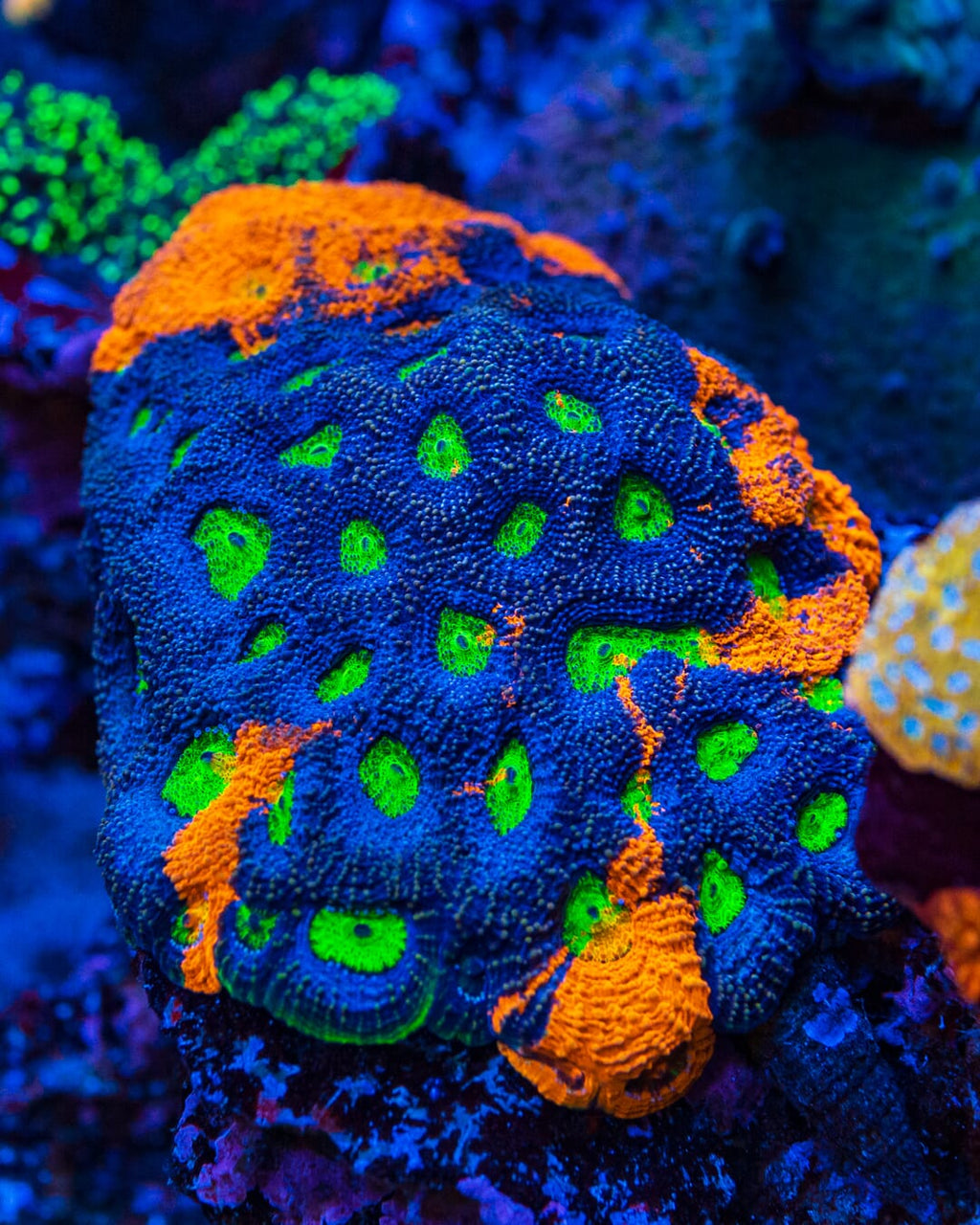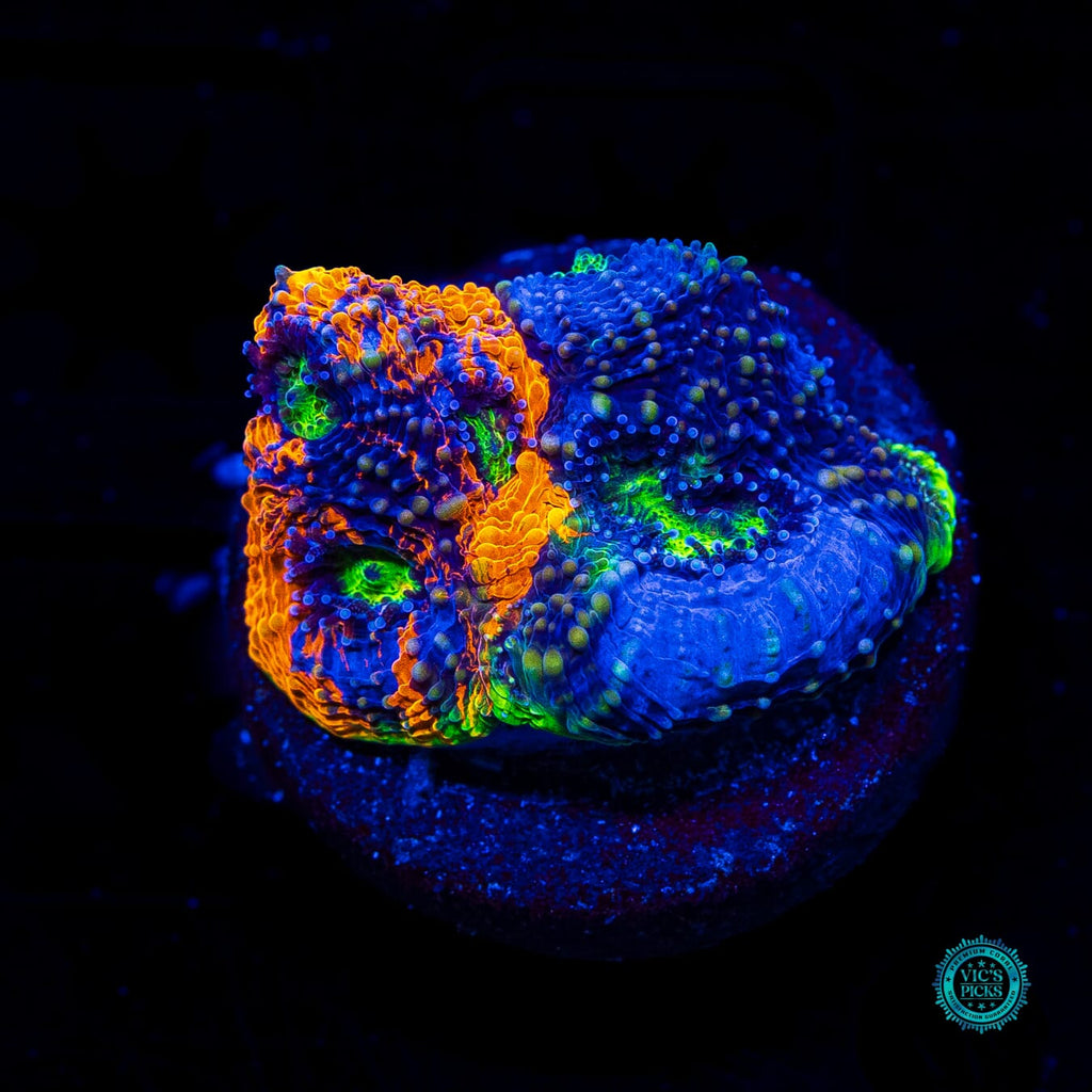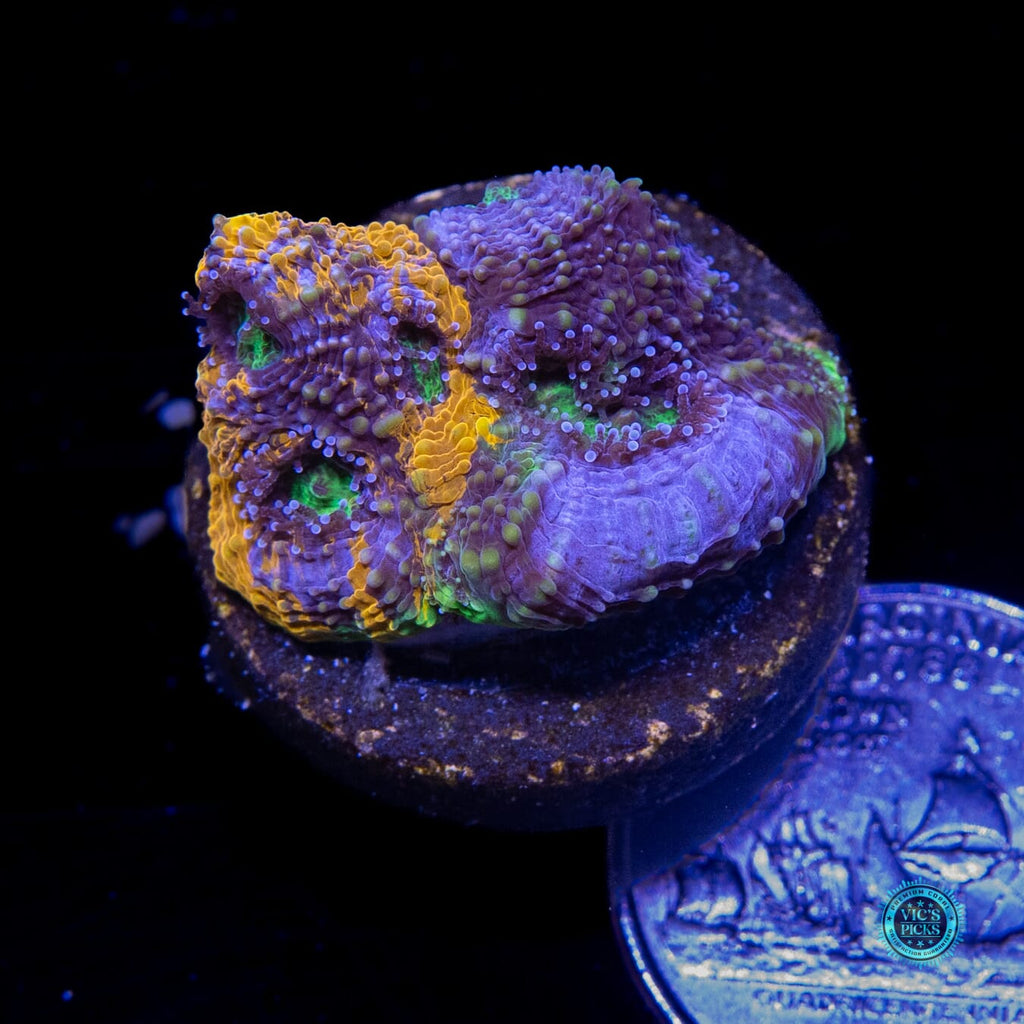 1.25" in diameter, WYSIWYG and fully farmed by WWC! - The one and only Mango Tango Echinata! Pretty much the hottest Echinata on the market today. This piece will blow your mind! We've been farming this Acanthastrea echinata for close to 8 years and it holds its color perfectly! Grab it as we only release around 10 pieces per year!