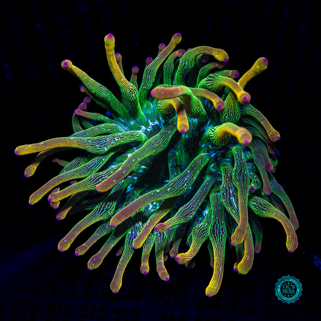 3" in diameter, WYSIWYG and fully conditioned by WWC! We are super excited about the New Release BTA! Look at all the speckling in the tentacles, and those yellow tips! It's wicked for sure! Aquacultured Bubble Anemone's can adapt to most anything you can throw at them! They can handle most water parameters, a range of lighting, and flow as long as they have a secure and safe place to anchor their foot they'll do great. Just be careful of placing corals in and around the bubble anemone as it will reach much further than you will want and end up slowly destroying whatever it touches. Also be cognizant that Bubble Anemone's can move around (especially when first placed into your reef) and because of that fact, you will need to place an anemone guard around all of your powerheads.