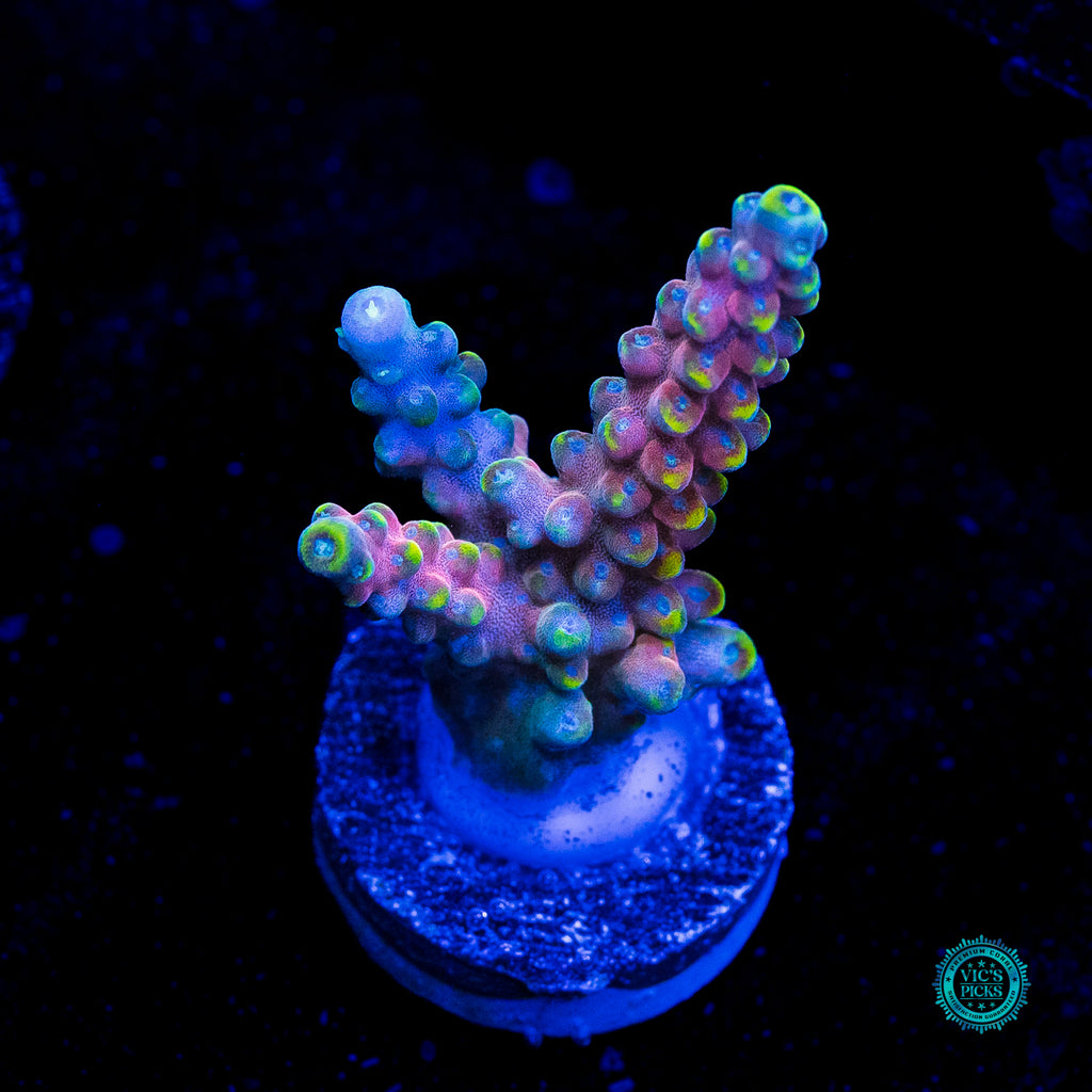1.75" x 1.25" WYSIWYG and fully aquacultured by WWC! This Acropora should be given and medium to high alternating flow and fed indirectly via broadcast feeding a couple of times per week with a good quality SPS food. Just make sure to not feed too much as this can ruin your water quality. Smaller amounts, more often is a good rule to follow. We find this Acro to be a good grower and can double its size every nine months to a year given a reasonably mature reef with stable parameters and placed in an area where it can receive medium-high to high alternating flow.