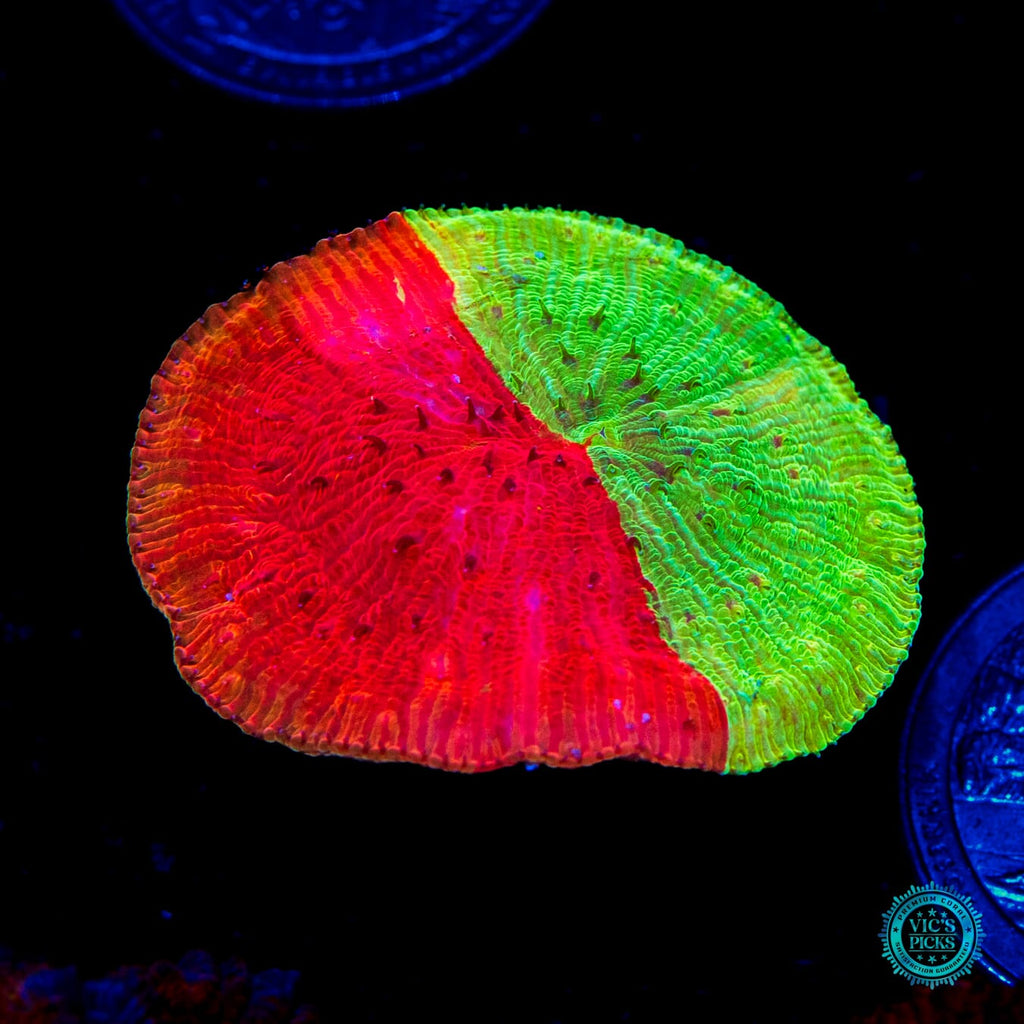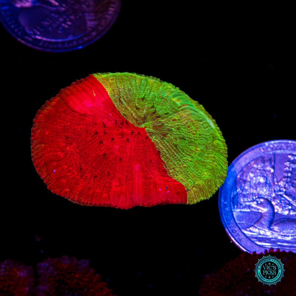 1.25" WYSIWYG and fully aquacultured by WWC! Our Diablo Hot sauce is screaming hot, but Diaseris plate coral is even hotter! It's quite possibly the most screaming red of any coral! I mean it is RED!!! Oh and it's grafted too, as it will gain streaks of purple, green and gold as it grows outward! A must have for any rare LPS collector!