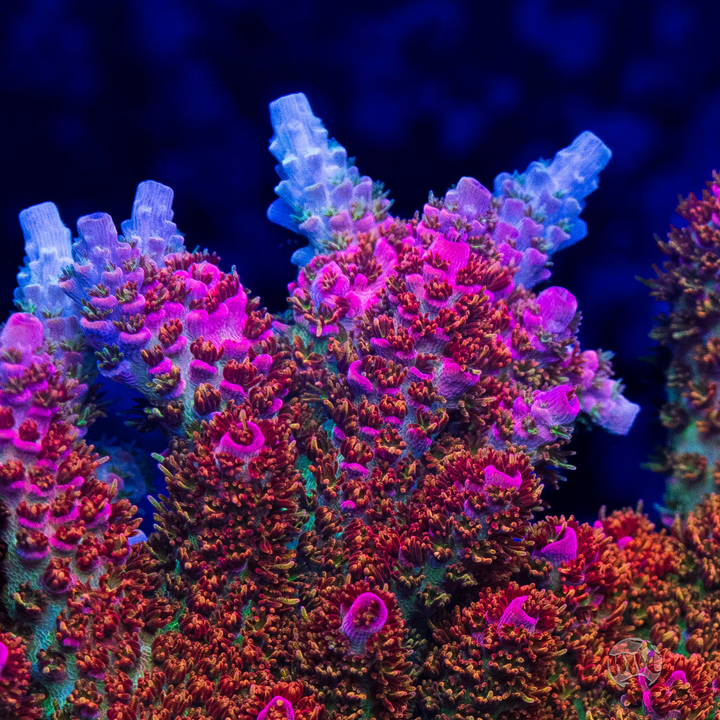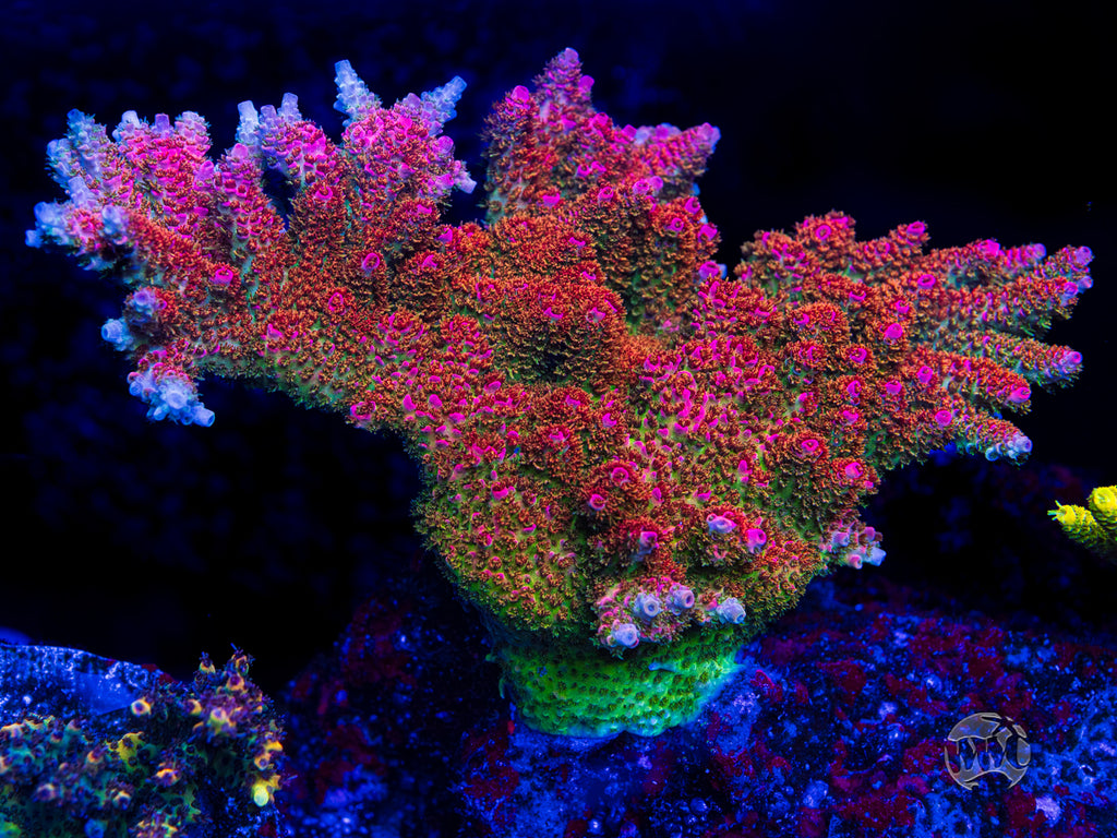 1.5" x 1" WYSIWYG and fully aquacultured by WWC! This insanely beautiful Acropora originally came from a wild Fiji colony over 9 years ago and was really nothing much to speak about at first. It took close to six months before we saw its underlying beauty come through. But once it adjusted to life in an aquarium the colors began to explode! This is a light loving Tabletop Acro and should be placed high in your reef so that it can receive somewhere in the vicinity of 250 to 300 par along with strong alternating flow. We would also recommend it be fed indirectly via broadcast feeding a couple of times per week . This piece is a good grower and can double its size every nine months to a year given a mature reef with stable parameters.