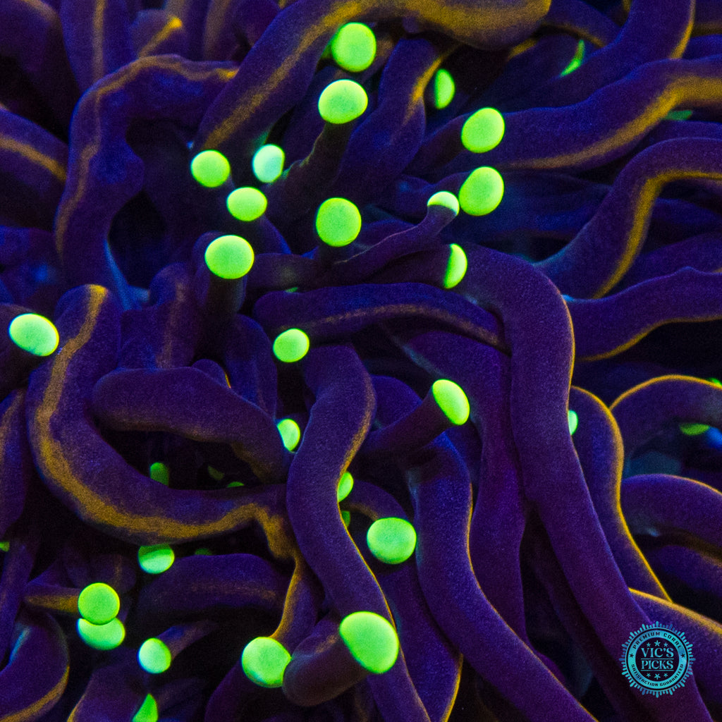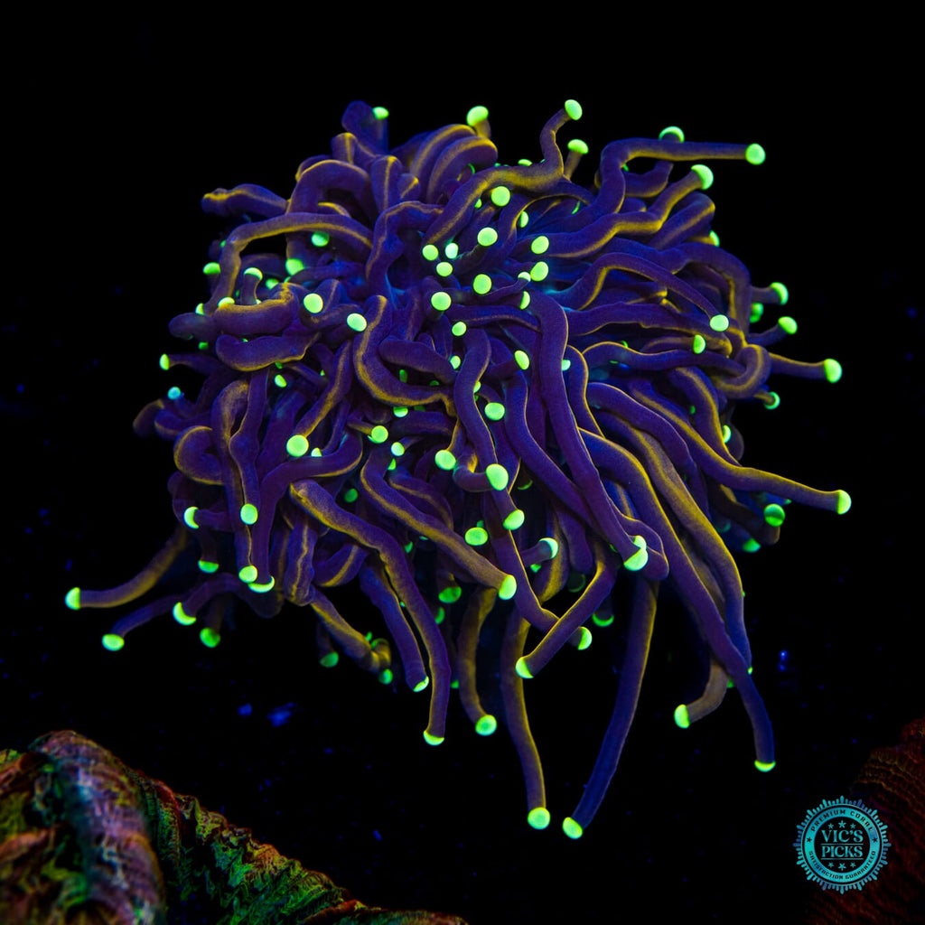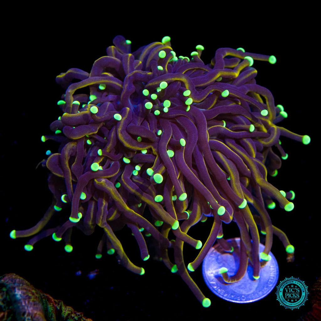 4" in diameter, WYSIWYG and farmed by WWC at our coral farm here in Orlando! - The tips of this torch are intense! Probably the brightest out there! They pretty much pop! We capture it pretty well with our photos, but it's a degree even brighter than that! Ohh, and we've been growing this torch out for several years, as such you can't go wrong as it'll be super hardy and should grow out incredibly well for you!