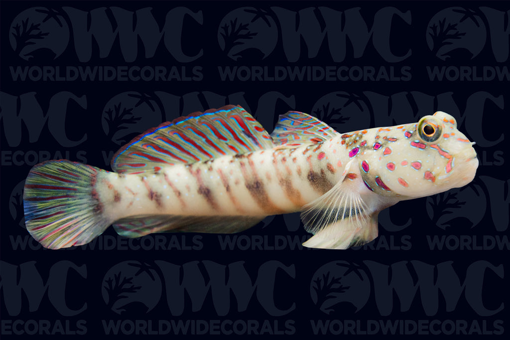 The Pink Spotted Watchman Goby is a hardy, reef-safe species admired for its unique partnership with pistol shrimp and its peaceful, inquisitive nature. It features a pale yellow to greenish body adorned with faint vertical bands and numerous pink to reddish spots scattered across the head, body, and fins—creating a soft yet striking appearance. Like other watchman gobies, it often forms a symbiotic relationship with Alpheus pistol shrimp, sharing a burrow where the goby stands guard while the shrimp maintains the entrance. In the aquarium, this species prefers a sandy substrate for burrowing and plenty of live rock for cover. It’s an excellent addition to reef aquariums, where it helps aerate the substrate and adds fascinating behavior to the tank. The Pink Spotted Watchman Goby thrives on a varied diet of meaty foods such as mysis shrimp, brine shrimp, and finely chopped seafood. Generally peaceful, it may show territorial behavior toward other bottom-dwelling gobies but coexists well with most reef-safe tankmates. Growing to around 4–5 inches, it’s best housed in a covered aquarium to prevent jumping.