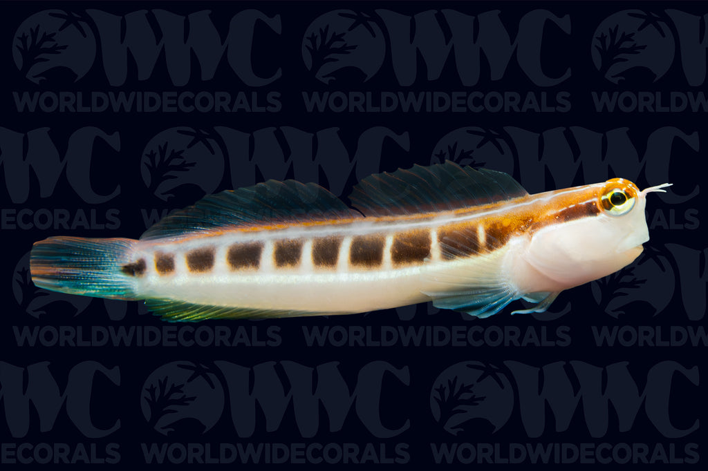 The Linear Blenny is a small, striking reef fish that adds both color and activity to a marine aquarium. Adults feature a pale lower body with a tan to yellowish-green upper body, decorated with horizontal white to yellow lines and a series of black rectangular blotches along the sides, creating a distinctive linear pattern. Like other blennies, they lack a swim bladder and spend much of their time perched on rocks or darting between crevices, so an aquarium with plenty of rockwork, ledges, and hiding spots is essential. Linear Blennies typically grow to about 3.5 inches (9 cm) and are suitable for tanks of 30 gallons or larger. They are generally peaceful but may defend their perch from other blennies. A tight-fitting lid is recommended, as they are known to jump. In the wild, this species is found across shallow coral reefs and rocky areas of the Indo-West Pacific, including southern Oman, the Philippines, northern Australia, and southern Japan. Omnivorous by nature, Linear Blennies thrive on a varied diet of algae-based foods, spirulina pellets, and frozen items like mysis or brine shrimp. Feeding twice daily helps maintain their vibrant coloration and overall health. Considered reef-safe, they do not harm corals or invertebrates, and their natural grazing helps control algae growth, making them both a beautiful and functional addition to the aquarium.