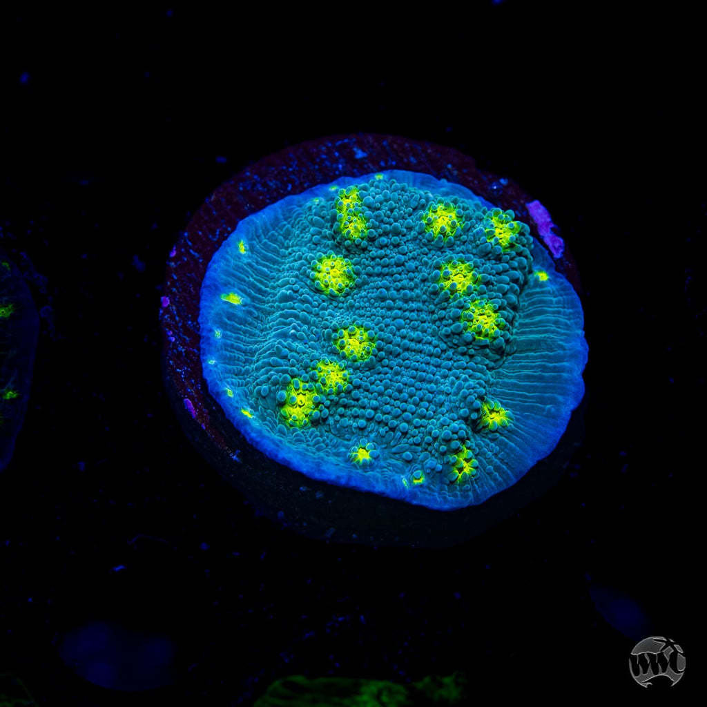 Hollywood Stunner Chalice (Echinopora sp.) has a purple and green base with bright neon green eyes. It will create swirling, scrolling patterns when left to grow to a mature size.
