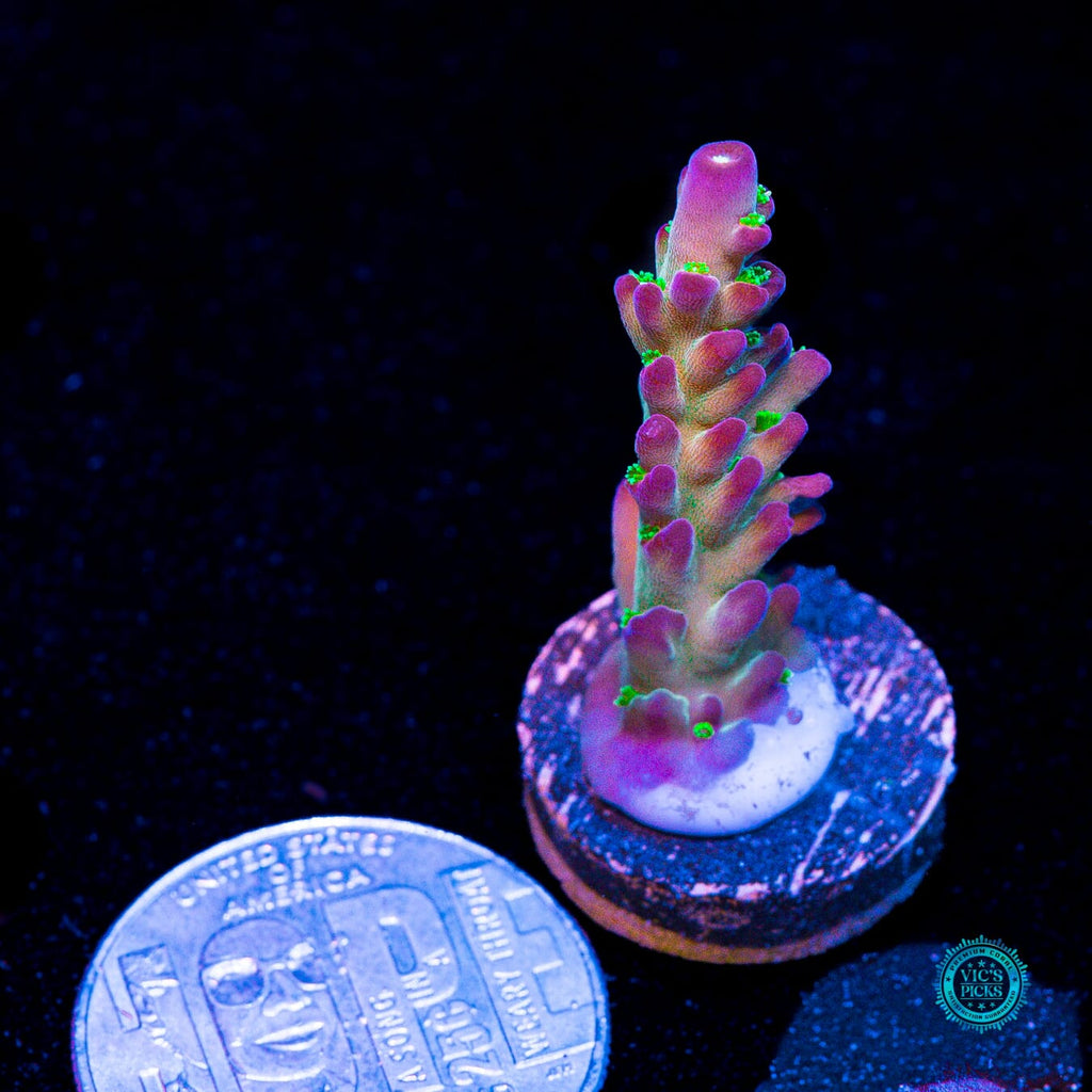 1.25" x .75" WYSIWYG and fully aquacultured by WWC! This Acropora should be given and medium to high alternating flow and fed indirectly via broadcast feeding a couple of times per week with a good quality SPS food. Just make sure to not feed too much as this can ruin your water quality. Smaller amounts, more often is a good rule to follow. We find this Acro to be a good grower and can double its size every nine months to a year given a reasonably mature reef with stable parameters.