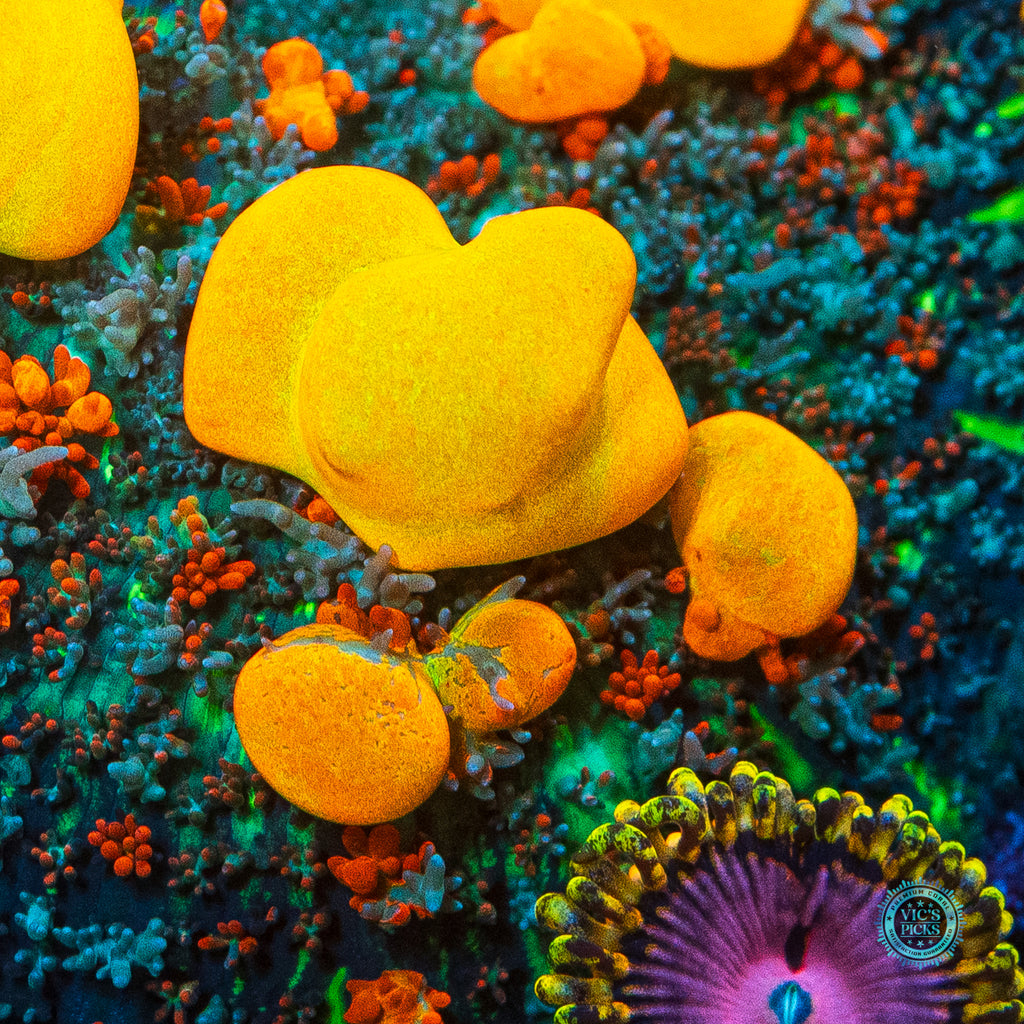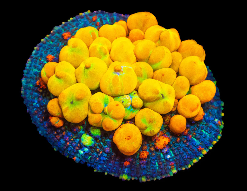 3" in diameter, WYSIWYG and fully conditioned by WWC! This specific OG bounce was grown out in Lou's personal office tank by the man himself! The one, the only, it's the OG Baby! You can't get any sweeter than this Bouncy Mushroom! They are pretty much the most ridiculous, mind-boggling, earth defying coral out there! I've seen a single polyp 6" across with bobbling bright orange and yellow bubbles that are over an inch in diameter! If you are ready for it and the price that comes along with it, this shroom will blow your mind! Place it low, like super low in your reef, with low flow and target feed it once per week and you'll be overjoyed once it starts to bud off and spread out in all directions! The trick with feeding Mushroom Corals is to hold a piece of meaty food in place with a pair of tweezers until the Mushroom grabs a hold of the food. And once the mushroom grabs onto it you will then be able to watch the cool process of the mushroom slowly closing up around the piece of food. It’s awesome to watch! Just like everything in reefing, be patient and you will be amazed at what transpires!
