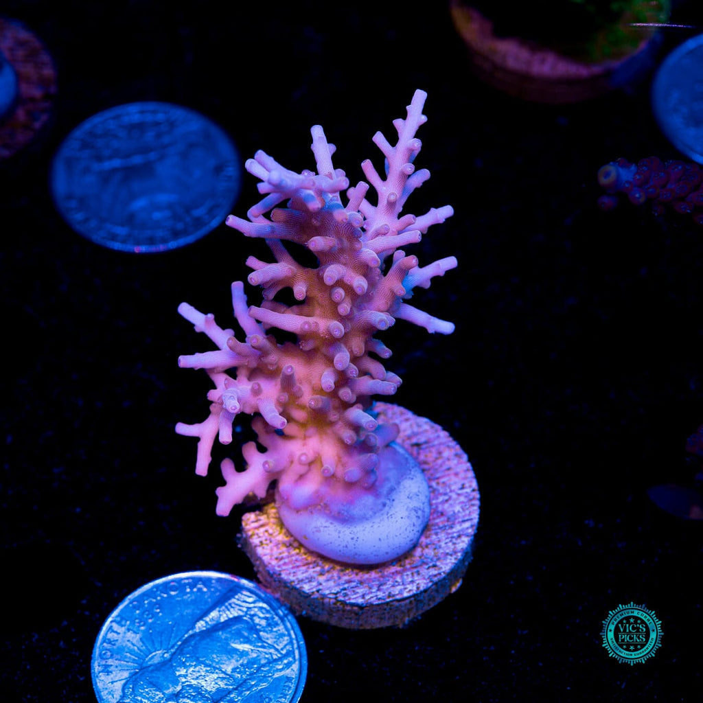1.25" x .75" WYSIWYG and fully aquacultured by WWC! This Acropora should be given medium alternating flow and fed indirectly via broadcast feeding a couple of times per week with a good quality SPS food. Just make sure to not feed too much as this can ruin your water quality. Smaller amounts, more often is a good rule to follow. We find this Acro to be a good grower and can double its size every nine months to a year given a reasonably mature reef with stable parameters.