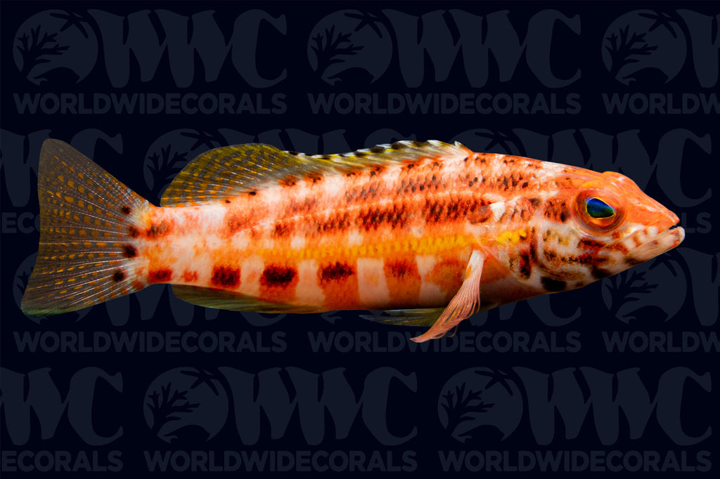 The Lantern Basslet is a small, vibrant reef fish prized for its striking coloration and interesting behavior. Adults have a pale body marked with dark orange to black oblong blotches and a series of black spots along the lower flank. This species often hovers beneath reef overhangs or within caves, adding a dynamic and visually engaging presence to the aquarium. Lantern Basslets typically grow to about 4.5 inches (11.5 cm), making them a manageable and attractive choice for marine hobbyists. In the wild, they inhabit shallow reefs of the western Atlantic, including southern Florida, the Bahamas, and the Caribbean. They prefer rocky or weedy areas and often associate with turtle grass beds. Juveniles may use empty conch shells or crevices for shelter, and adults are mildly territorial, feeding on small benthic invertebrates such as caridean shrimp and tiny fish. In the aquarium, Lantern Basslets thrive in well-established tanks with plenty of live rock, caves, and hiding spots that mimic their natural environment. They are carnivorous and require a diet of finely chopped fresh or frozen marine foods, including mysis shrimp, brine shrimp, fish, and squid, ideally fed multiple times daily. Considered reef-safe, Lantern Basslets do not harm corals or invertebrates. With proper care, their vivid coloration, small size, and engaging behavior make them a rewarding addition for both beginner and experienced marine aquarists.