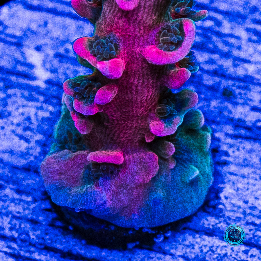 This Acropora should be given and medium to high alternating flow and fed indirectly via broadcast feeding a couple of times per week with a good quality SPS food. Just make sure to not feed too much as this can ruin your water quality. Smaller amounts, more often is a good rule to follow. We find this Acro to be a good grower and can double its size every nine months to a year given a reasonably mature reef with stable parameters and placed in an area where it can receive medium-high to high alternating flow.