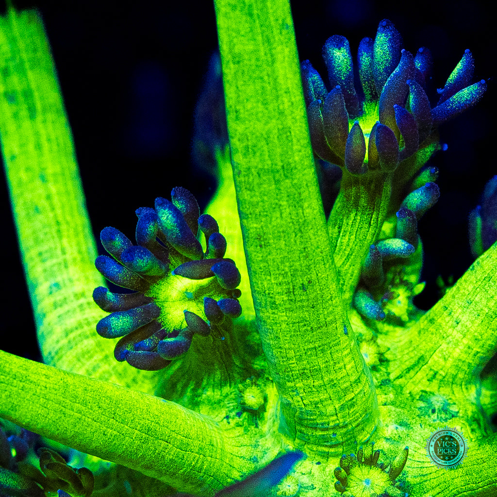 We have been growing out this unique color morph for several years now. The insaely bright neon green stalks contrast the lavender petal of the polyp so beautifully. AND as it grows out it stays THAT BRIGHT! Unfortunately, Goniopora still get a bad rap. Gone should be the thought of them possibly not doing well for the intermediate or advanced reefer. We have over 40 varieties growing out in our farm and if we can do it, so can you! Goniopora prefer lower to medium-low par (125 to 175), with medium alternating flow and to be target fed an SPS food (due to their smaller mouths at the end of each tentacle) several times weekly. Just don't over do it. A couple of squirts is all it takes.