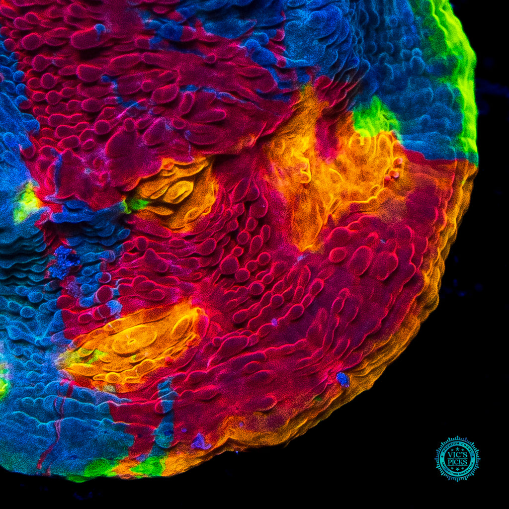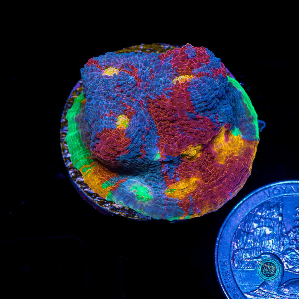 1.25" in diameter WYSIWYG and fully aquacultured by WWC! - The Supa Fly is one of our classic Rainbow Chalice's. It's not quite as marbled as the Jellybean and has a more intense red and a deeper blue! This chalice is a must have for any serious Rainbow Chalice collector!