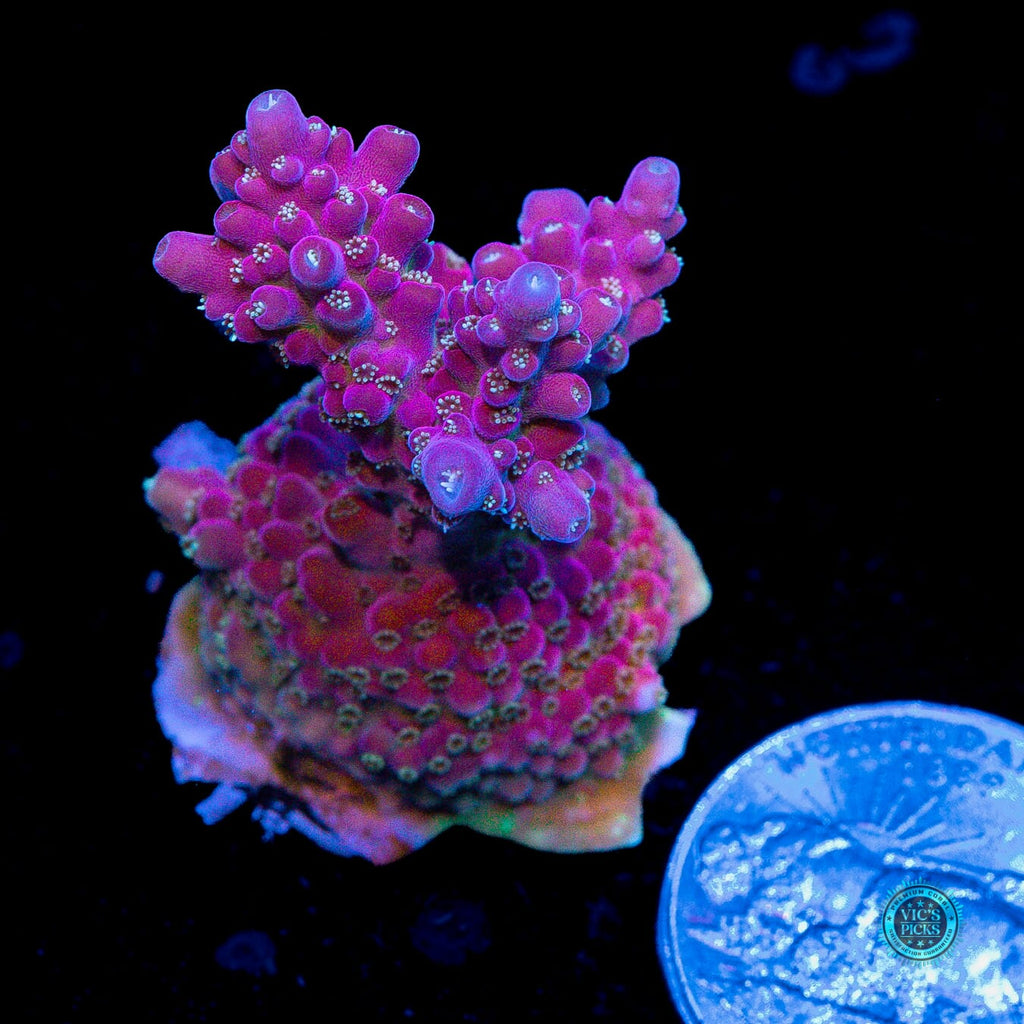 1.5" x 1" WYSIWYG and fully aquacultured by WWC! We have been growing the WWC Whiplash Acropora out for around 6 years now in several different display tanks and it has fast become one of our most desirable Acropora. You can see why as the rainbow of colors are just out of this world and there's nothing like else in our collection! The larger this colony grows the more insane it becomes as it develops these divine deep purple tips.