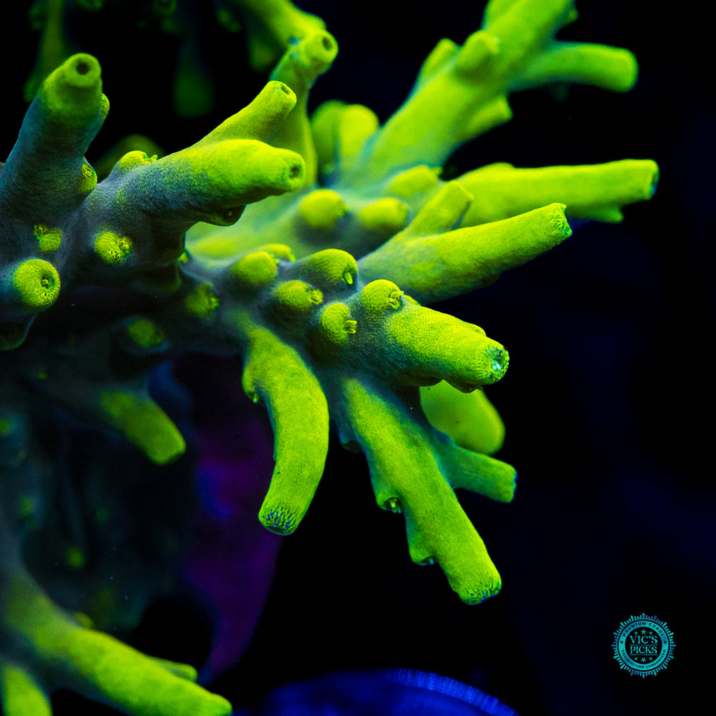 3" x 3" WYSIWYG and fully aquacultured by WWC! Yellow is one of those colors that is tough to find in reefing. And albeit the Yoda Acro isn't a perfect yellow it's pretty dang close! And being the super cool species of Acropora caroliniana with all the smooth branches makes it pretty freaking cool as well.